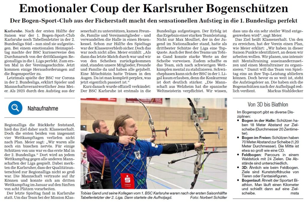 Die badischen neusten Nachrichten von letzter Woche erschien ein Bericht über den Aufstieg unserer Mannschaft in die 1. Bundesliga Bogen Süd.